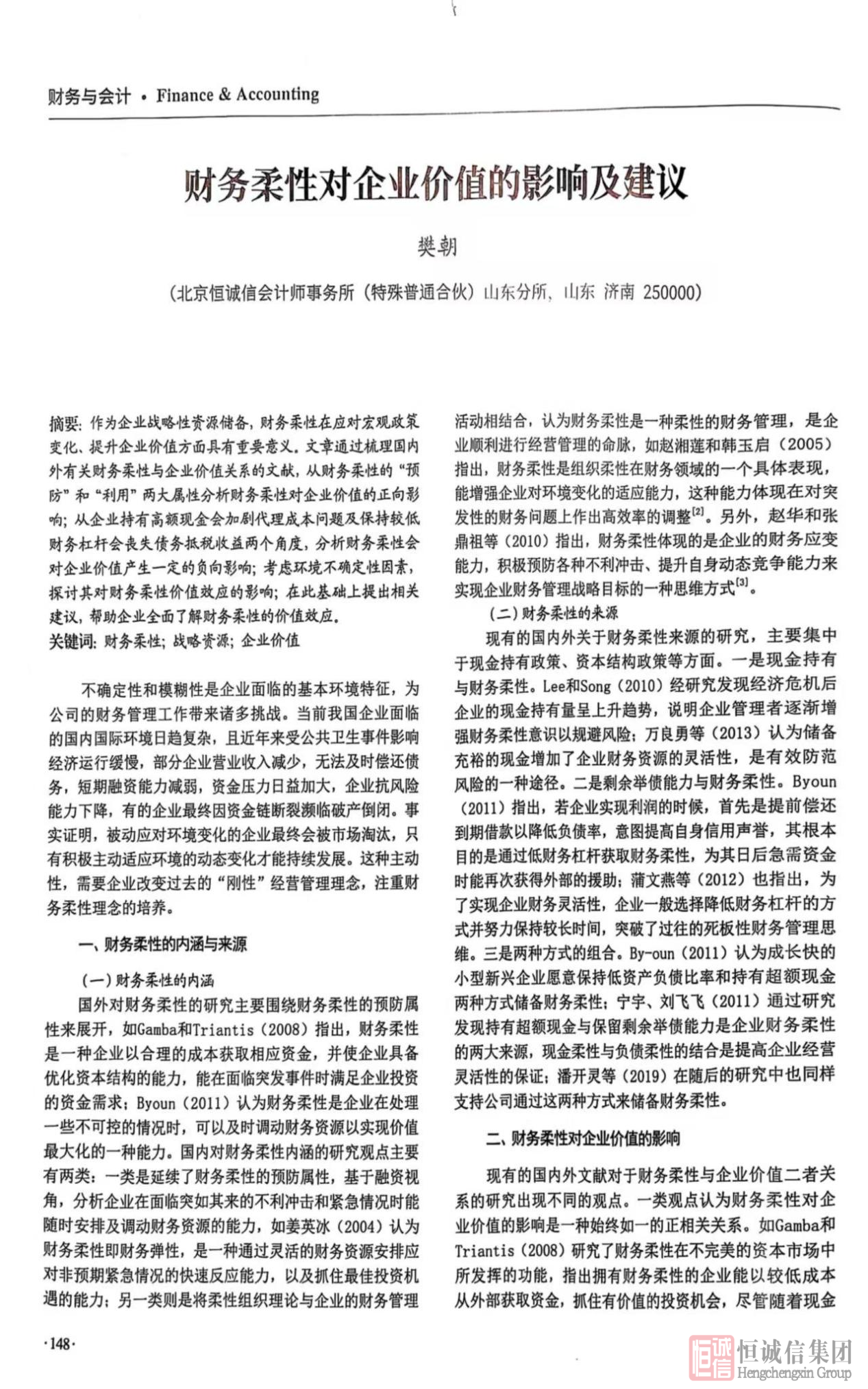 近日,北京恒誠信會(huì)計(jì)師事務(wù)所(特殊普通合伙)山東分所樊朝撰寫的學(xué)術(shù)論文《財(cái)務(wù)柔性對(duì)企業(yè)價(jià)值的影響及建議》,在省級(jí)期刊《知識(shí)經(jīng)濟(jì)》的 “財(cái)務(wù)與會(huì)計(jì)” 板塊成功發(fā)表。這一成果不僅是樊朝個(gè)人學(xué)術(shù)研究能力的體現(xiàn),更是恒誠信會(huì)計(jì)師事務(wù)所重視專業(yè)人才培養(yǎng)、推動(dòng)學(xué)術(shù)研究與知識(shí)創(chuàng)新的有力見證。